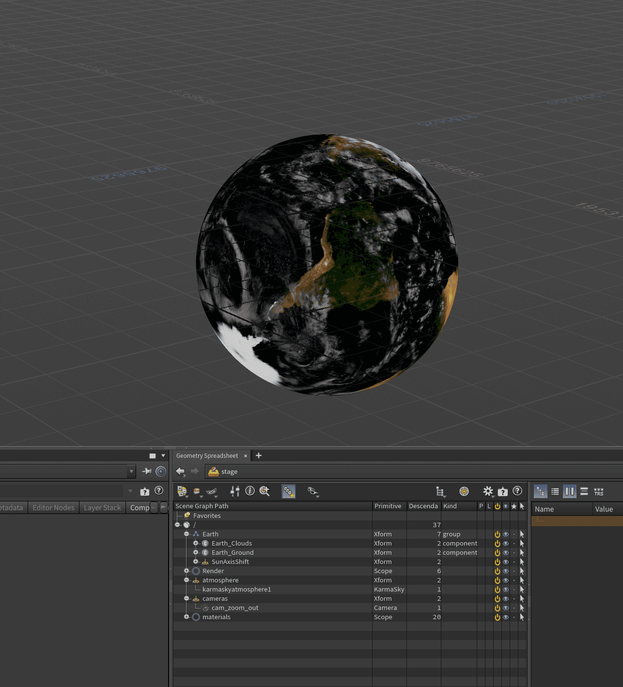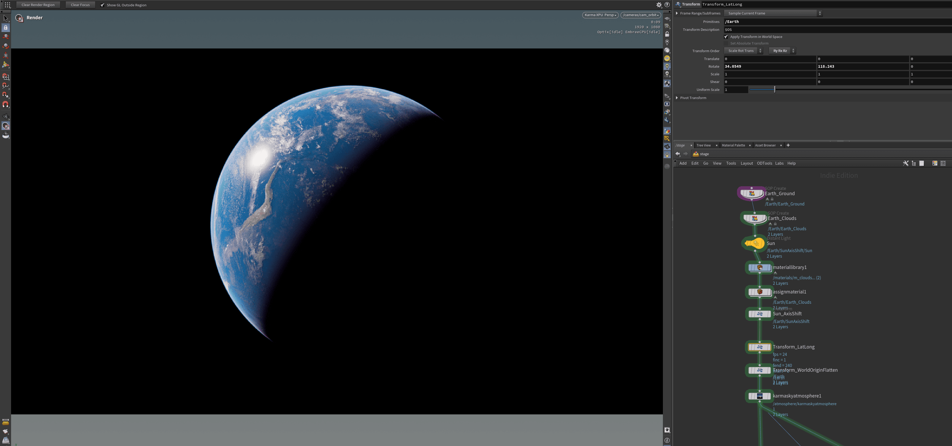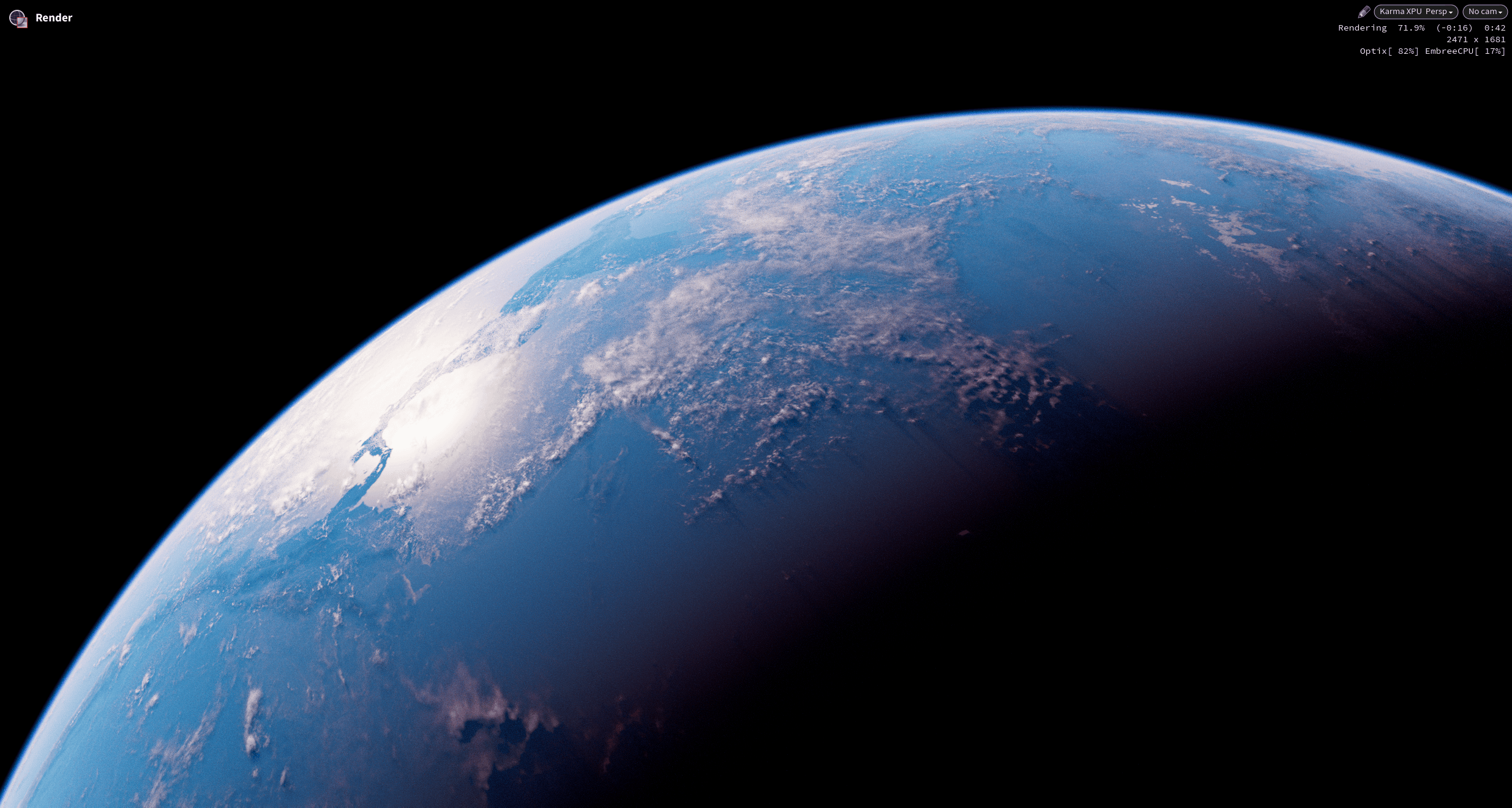 If I had a nickel for every time I was asked to do a God's eye / Earth Orbit shot zooming down to the ground, I'd have nearly a dollar. I've always had a fascination with rendering space imagery in Blender (the image below is nearly a decade old). But in recent years I've needed to create this type of stuff in both Unreal & Houdini, and so with Karma coming out of beta I built a super simple setup.